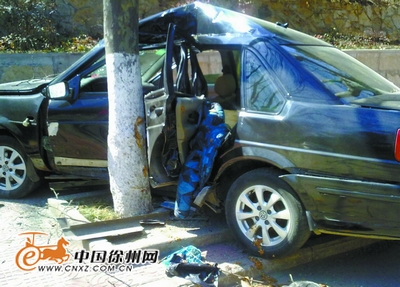桑塔纳拐弯太猛撞树上 车身严重变形