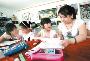 毕嘉溢的母亲张女士下岗在家,去年又查出患有尿毒症,每月光透析就要花上几千元,家境困难。得知二眼井社区联合新风志愿者服务总队开展免费课程辅导,她每周六上午都准时送孩子来进行两个小时的辅导。张女士说:“老师不仅给辅导功课,还带孩子们一起做游戏,讲故事,学民间手工艺,‘周末课堂’真是孩子们的乐园。”