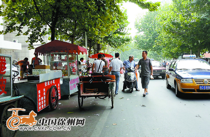 路西约20多米长的人行道被挤的满满的,行人只好从快车道绕过。而快车道边上也停了几辆等活的出租车,占据了半幅行车道。儿童医院对面路东的马路上,各种小吃摊点摆成一排,竟有20多个临时摊点,使本来就不宽的道路难以通行,而一些市民使用过的一次性碗筷更是被随手丢弃。