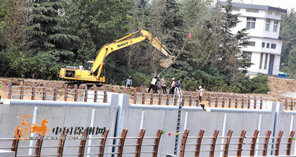 10月6日上午10时,蔺家坝复线船闸施工现场一片繁忙景象,十几台挖掘机正在挖土坑,一旁放着十几棵大型树木正待栽植;800余名工人正在进行下游引航道、导航墙结构物施工。