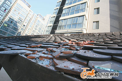 轿车不远处是通往公园的游廊。游廊屋顶近1平方米的瓦片被砸碎,游廊边地面上散落着更多的铝塑窗框边和碎片等。