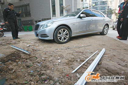 事发后不久记者来到天山绿洲二期。3号楼下停着一辆银灰色奔驰E300轿车,轿车前引擎盖、前挡风玻璃和天窗上布满一个个砸出的凹坑,格栅也被砸坏。在车头前地面上散落着两根铝塑窗框边,以及碎玻璃等。