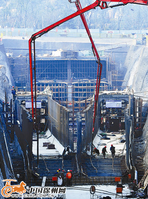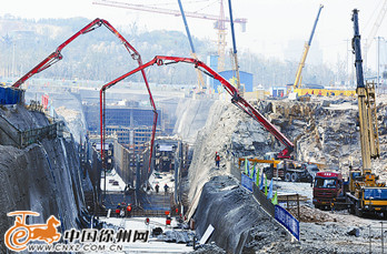 11月19日,记者在我市轨道交通1号线一期工程试验段施工现场看到,各种施工机械遍布,几台大型混凝土浇灌机正在巷道内浇灌水泥,一派热火朝天的施工景象。