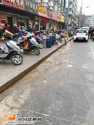 16日上午9时许,记者再次来到该路段看到,慢车道上积存有四五厘米厚的油污水。油污水直流到机动车临时停靠点旁,形成了一二十米长的油水带,最后流进饭店门前的雨水管道。
