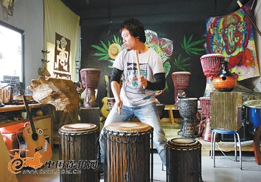 七年前,25岁的十坎还在海云电脑城当一名电脑组装工。一次外出游玩中,他偶遇非洲鼓,那充满韵律、特别的鼓声一下子让他着了迷。回来后,他开始学习打非洲鼓。如今七年过去,他不仅收藏了包括金贝鼓、巫毒鼓、墩墩鼓等23只鼓,而且也完成了自己的职业转型,成为一名职业鼓手。一个多月的工资买来一只鼓