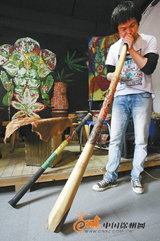 除了造型各异的各种鼓,十坎也收集着其他稀奇古怪的玩意,一问原来都是乐器:比如眼前这根近2米长的绘满花纹,状似象牙的长管,它由上至下逐渐变粗,下部微微弯曲起来。十坎介绍,它是澳洲传统乐器“迪吉里杜管”,是一种低音吹奏乐器,只能做配乐用。说着,他用手把住它,把嘴巴凑过去用力吹奏起来:立刻,一种有些像动物沉闷的叫声,也有点类似于呼麦的饱含韵律声音,在房间里弥漫起来。