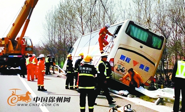 救援:吊车绑住大客车避免侧翻出事地点位于连霍高速徐州方向单集出口西侧约800米处,北侧一段高约1米的护栏被撞断,撞出一个长约30米的大豁口,五根高约80厘米、直径约20厘米粗的护栏立柱被撞倒。现场一位救援人员表示,如果不是几根立柱卡住客车底部,支撑住客车,客车早已从路基上翻了下去。