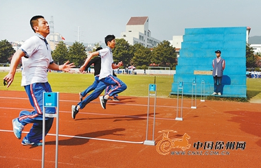 在50米跑的考试现场,记者看到,今年在起点处和终点处增设了一台电子测试仪。裁判在起点发号施令之后,起点的大屏幕上就会开始显示计数,而终点的红外线感应到考生到达之后,就会让大屏幕上的数字停下来,每一位考生的成绩都会显示在起点的屏幕上。市教育局体卫艺处负责人介绍,今年采用的电子测试仪有三个优点:“第一,它不同于往年的人为计数,所有的成绩当场显示,公开透明,也就避免了许多人为因素对成绩的干扰;第二,电子测试仪计数由红外线在终点处感应,因此十分灵敏,不会出现认为反应慢的情况;第三,因为电子测试仪灵敏度太高,所以我们在每位学生的成绩上还要减去0.5秒,而根据国际的惯常做法,100米跑要在成绩上减去0.24秒,所以对学生的成绩还是很有利的。”