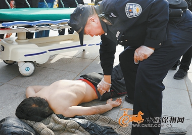 中国徐州网-都市晨报热线68886888消息(记者 沈扬)男子半裸身体趴伏医院门前一动不动,热心市民担心其安全,报警并联系医院。很快,民警赶来为男子穿上衣服,医院也推来车辆将其带入门诊病房治疗。这是昨天下午发生在市中心医院门前的一幕,而令人惊讶的是,无论民警还是医生,都对这名男子很熟悉。