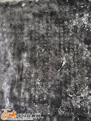 在县博物馆的碑园入口北侧,靠墙立着两块断碑,这就是丁山发现的石碑。靠南的石碑较大,从造型上来看应该是竖碑的下半部,北侧的石碑缺角一端呈圆弧状,是竖碑的上半部。据测量,这块石碑高2.42米,宽0.90米,厚0.15米。石碑上文字如硬币大小,排的密密麻麻。