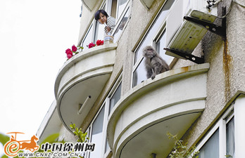 3楼一位女士隔着玻璃,眼睁睁看着猴子在自家晾衣架上折腾,想拿棍子赶走它,却担心它失足掉下去摔伤,只能拍着玻璃吓唬吓唬它。不过,这招并不好使,猴子丝毫不理解女主人的好意,依旧在晾衣架上自得其乐,还时不时向室内张望。