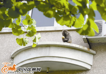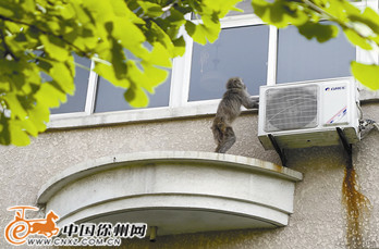 中国徐州网-彭城晚报讯 (记者 林刚) 昨天清晨,一只猴子突然出现在康居小区A1号楼一单元,在窗台上赖着不走不说,还试图从阳台窗“非法”入室,把附近居民吓了一跳。闻讯赶来的民警和市动物园工作人员尝试将这位不速之客“缉拿归案”,但几经努力还是没成功。受惊吓的猴子独自蹲在6楼空调室外机上,享受着初夏的阳光。有位买菜路过的大妈说:“它猴精猴精的,人哪能逮着它。”这可把围观的居民逗乐了。