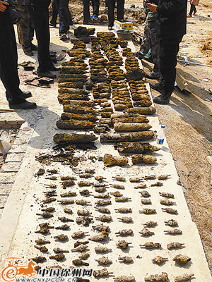 经过两天奋战,施工现场共挖出各类炮弹163枚、手榴弹4枚、各类引信144枚、底火装置34枚。专业处理后交由公安部门运至指定地点集中销毁。