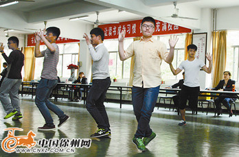 中国徐州网-徐州日报(记者 甘晓妹) 随着老师的口令,5位男生先做起了广播操中的跳跃运动,接着又模仿起一段舞蹈动作……昨天开始,2015年学前教育专业免费师范男生面试在徐州幼儿师范高等专科学校进行。两天时间里,437名徐州考生和252名连云港考生,逐一接受五官形体、普通话、音阶摹唱、美术、舞蹈等画、唱、说、跳环节现场测试。