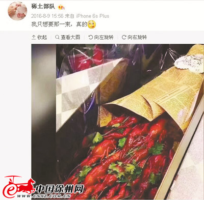 “修齐”说,他们夫妻俩有两个女儿,一个8岁,一个还不满1岁,老婆每天忙里忙外很是辛苦。情人节之前,他就在给老婆准备礼物,原本买了一块玉石籽料,委托朋友做成戒指。可朋友“掉链子”窝了工,情人节时戒指也没做好。他一大早就看到有人在朋友圈里晒了“龙虾花束”,觉得这个礼物不错,很鲜艳很好看,看完之后还能吃,于是也给妻子订了一束。这个龙虾花束198元(内有龙虾19只),同城快递16元,加起来正好是214元,很应景的数字。龙虾花束送到后,老婆很惊喜,第一时间发了朋友圈,很多人点赞,他也觉得倍有面子。