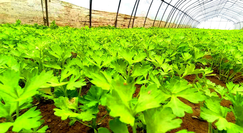 今年52岁的方庄村李丕彩正在大棚里查看芹菜长势,从23岁嫁到方庄村就和老伴种植大棚蔬菜,她有三个大棚,一亩地一个大棚,一稻双菜(6月—10月种植水稻,11月-来年2月种植反季节蔬菜,3月-5月种植蔬菜),往年她种植蔬菜、水稻要用复合肥、尿素、鸡粪、猪粪等,收集来的鸡粪、猪粪等都堆放在村庄附近或道路两旁,气味难闻,给农村人居环境整治带来很坏影响,群众意见很大。现在她用上了“易腐垃圾+厕所粪污”绿色协同处置中心的沼液,只出部分运输费。用沼液浇灌、施肥的芹菜长势喜人,颜色青绿好看,口感爽脆。