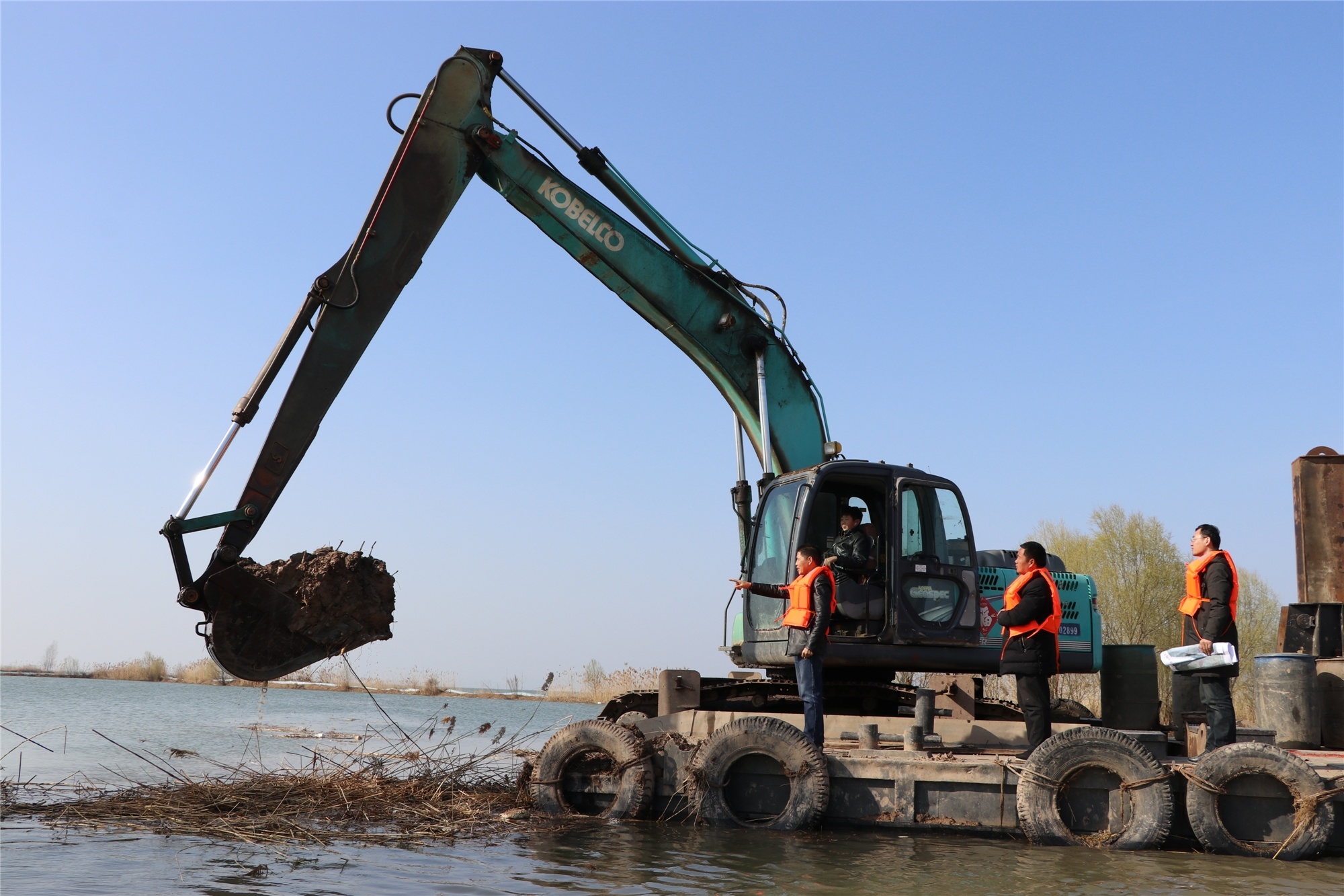 3月11日上午,在徐州市沛县杨屯镇大山湾村一处鱼塘,大型挖掘机正在对该处鱼塘围圩进行拆圩施工,临近的鱼塘围圩已经破拆完毕。