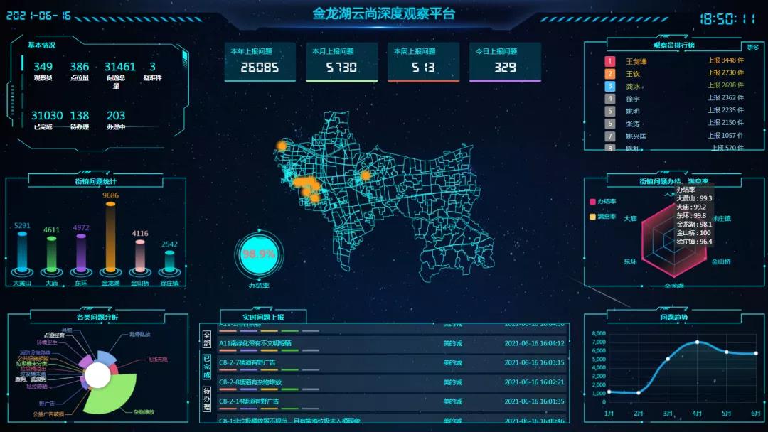 “以往发现和解决此类问题,需要专人排查、汇总,再派发解决,现在,通过手机‘深度观察’云平台,辖区群众人人都可以上报信息,按照所属网格,无缝对接责任人进行核实、解决。”宣传部副部长陈冰表示,通过数据赋能,目前,全区已实现了文明城市创建的全员全域覆盖,各类信息的秒传、秒对接也加速了问题的解决;定期的数据汇总分析,也让后期的城市管理更有针对性;对于不能立刻解决的问题则归为疑难件,会按照属地原则,由专人进行跟进处置,目前的疑难问题主要集中在僵尸车、公共设施破损、缺失等领域。