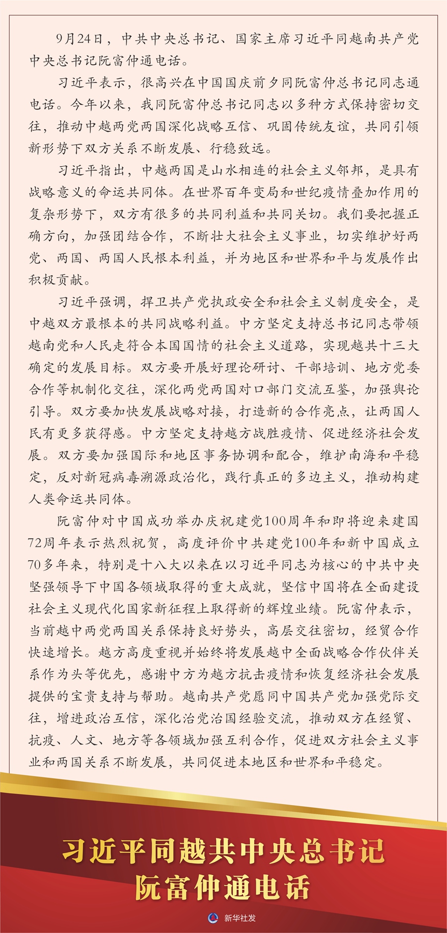 9月24日,中共中央总书记、国家主席习近平同越南共产党中央总书记阮富仲通电话。