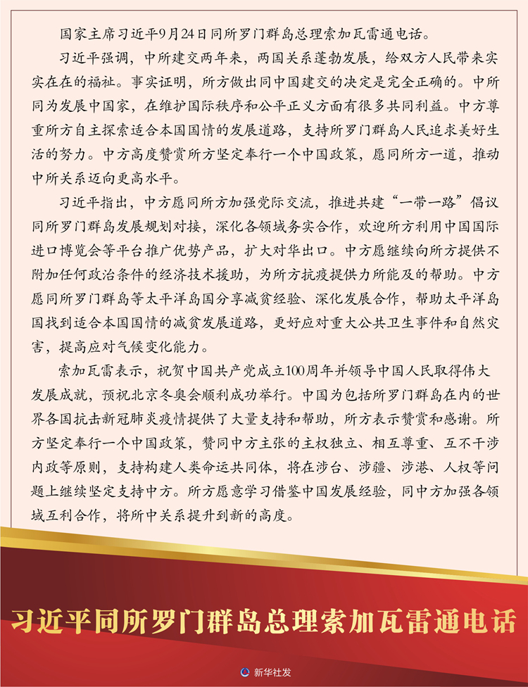 新华社北京9月24日电 国家主席习近平9月24日同所罗门群岛总理索加瓦雷通电话。