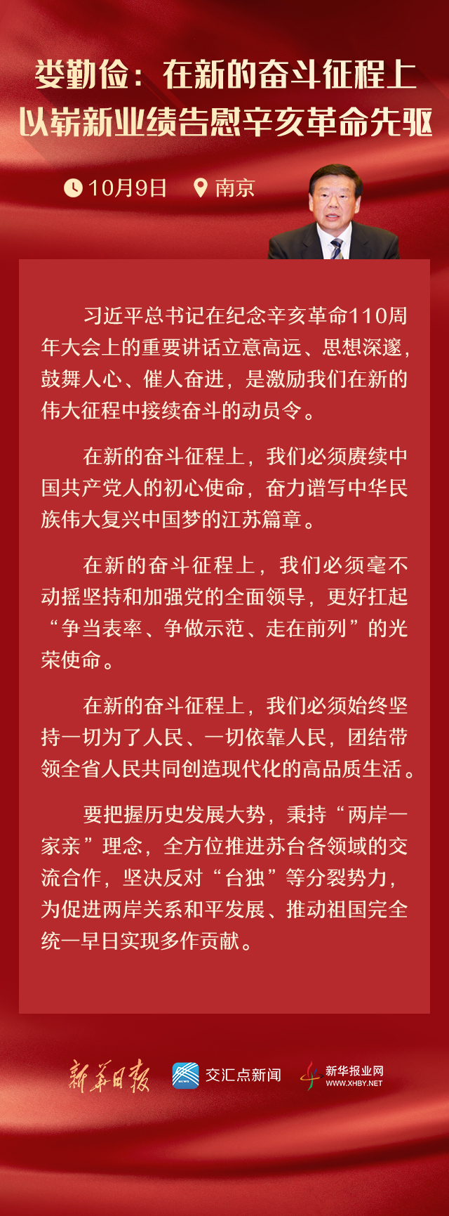 交汇点讯 10月9日下午,江苏省暨南京市辛亥革命110周年纪念会在宁举行。省委书记、省人大常委会主任娄勤俭在纪念会上讲话,强调要深入学习贯彻习近平总书记在纪念辛亥革命110周年大会上的重要讲话精神,在新的奋斗征程上以崭新业绩告慰辛亥革命先驱,坚决扛起“争当表率、争做示范、走在前列”的光荣使命,奋力谱写中华民族伟大复兴中国梦的江苏篇章。