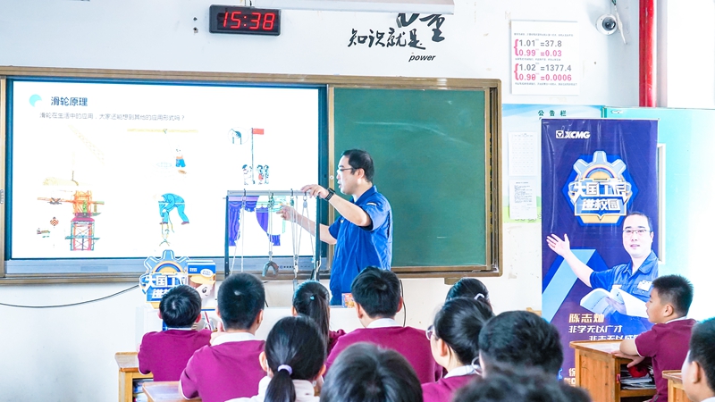 “有没有见过大吊车?有没有同学能告诉我,大吊车有哪些物理原理?动滑轮与定滑轮有什么不同?……”来自徐工重型机械有限公司大吨位起重机调试技能工艺师李戈的直击9连问,丝毫没有难住矿大附中初二年级的学生们,他们精准简练、完全正确的回答,让李戈直呼“哇,同学们太优秀了!”