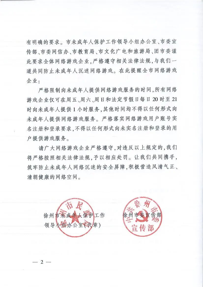 11月16日,徐州市未成年人保护工作领导小组办公室(市民政局)、市委宣传部、市委网信办、市教育局、市文化广电和旅游局、共青团徐州市委联合向全市网络游戏企业印发《社会公开信》,要求针对未成年人过度使用甚至沉迷网络游戏问题,进一步严格管理措施,坚决防止未成年人沉迷网络游戏。
