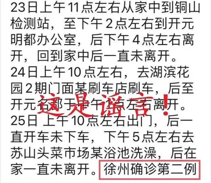 11月26日晚间起,我市一些微信群组陆续出现涉及部分密切接触者个人隐私及流调轨迹的信息传播,并发布“徐州确诊第二例”等言论。经查,以上传播信息均为谣言,市网信、公安等部门将依法依规严厉查处恶意造谣传谣行为。