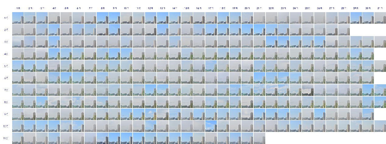 从这3247张蓝天日记图可以看出,灰色的天空越来越少,蓝色的天空越来越多。与2013年相比,2020年黄泥天消失了,灰霾天明显变少。2021年的天空较2020年又有明显改观,“水晶蓝”成为常态。PM2.5浓度的下降,大幅提高了大气能见度,空气越来越清新、透亮。