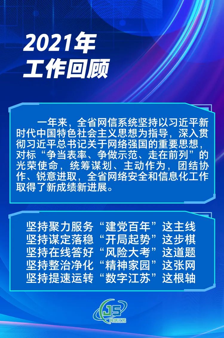 会议指出,2021年是党和国家历史上具有里程碑意义的一年,也是江苏迈上社会主义现代化建设新征程的第一年。一年来,全省网信系统坚持以习近平新时代中国特色社会主义思想为指导,深入贯彻习近平总书记关于网络强国的重要思想,全面贯彻党的十九大和十九届历次全会精神,深入落实省第十四次党代会精神,对标“争当表率、争做示范、走在前列”的光荣使命,持续抓好中央决策和省委部署的贯彻落实,全省网信工作取得了新成绩新进展,为我省高质量发展提供了有力支撑。