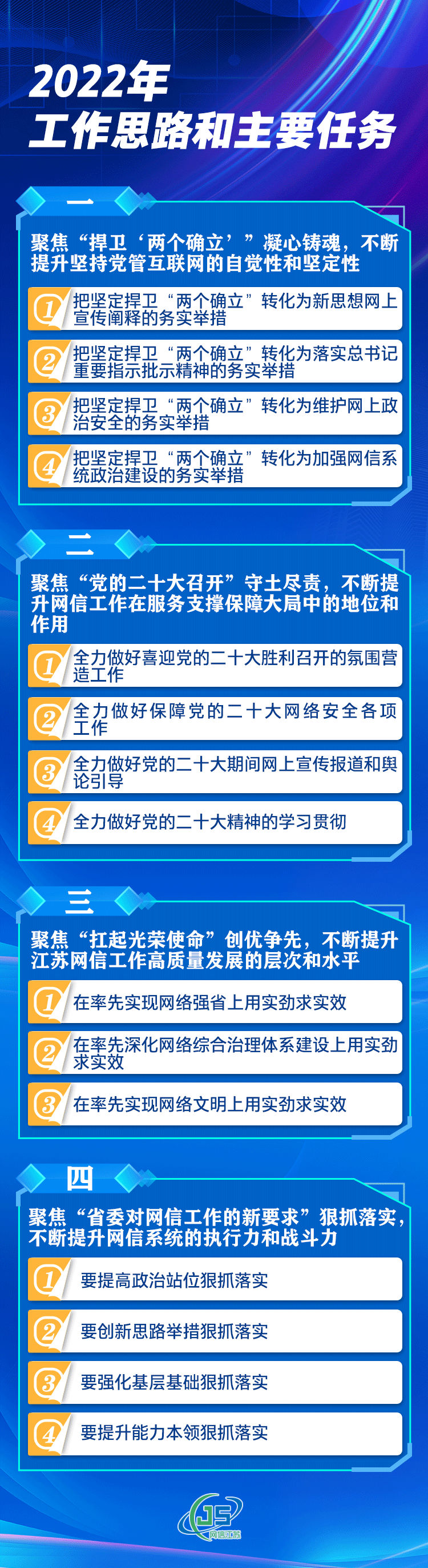 会议强调,2022年是党的二十大召开之年,也是全面落实省第十四次党代会精神开局之年。做好2022年全省网络安全和信息化工作,必须坚持以习近平新时代中国特色社会主义思想为指导,认真贯彻落实习近平总书记关于网络强国的重要思想,全面贯彻党的十九大和十九届历次全会精神,深入落实省第十四次党代会精神,弘扬伟大建党精神,深刻领悟“两个确立”的决定性意义和实践要求,增强“四个意识”、坚定“四个自信”、做到“两个维护”,坚持稳中求进工作总基调,按照省委书记吴政隆对网信工作的批示要求,紧紧围绕迎接服务保障和学习宣传贯彻党的二十大这条主线,全面提高网络安全和信息化工作水平,为坚决扛起“争当表率、争做示范、走在前列”光荣使命,奋力谱写“强富美高”新江苏现代化建设新篇章提供有力服务、支撑和保障。