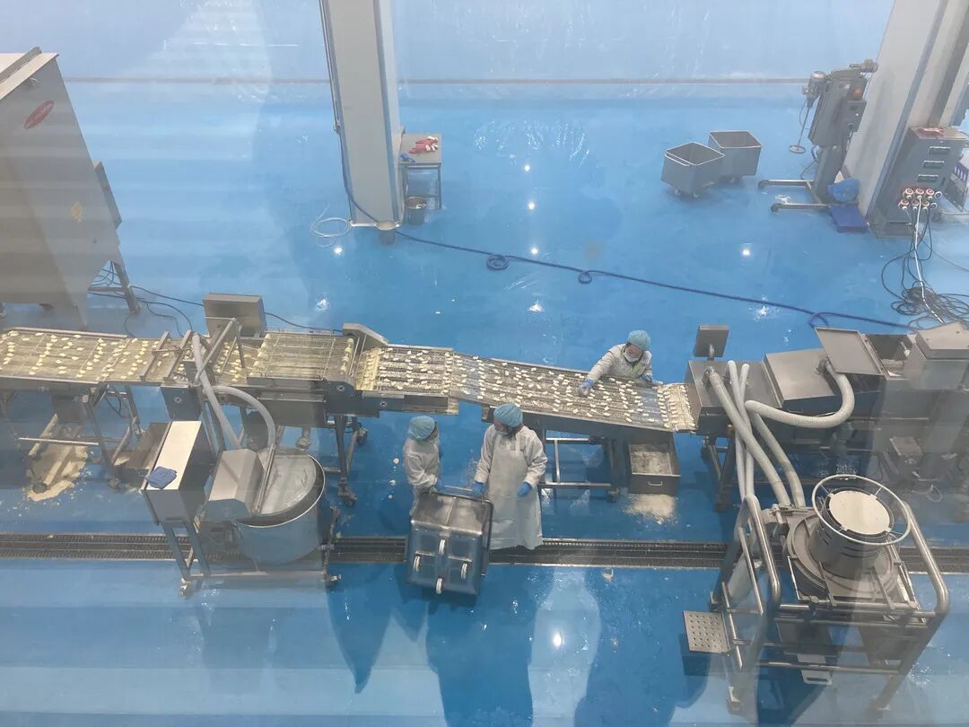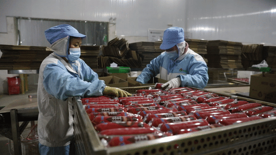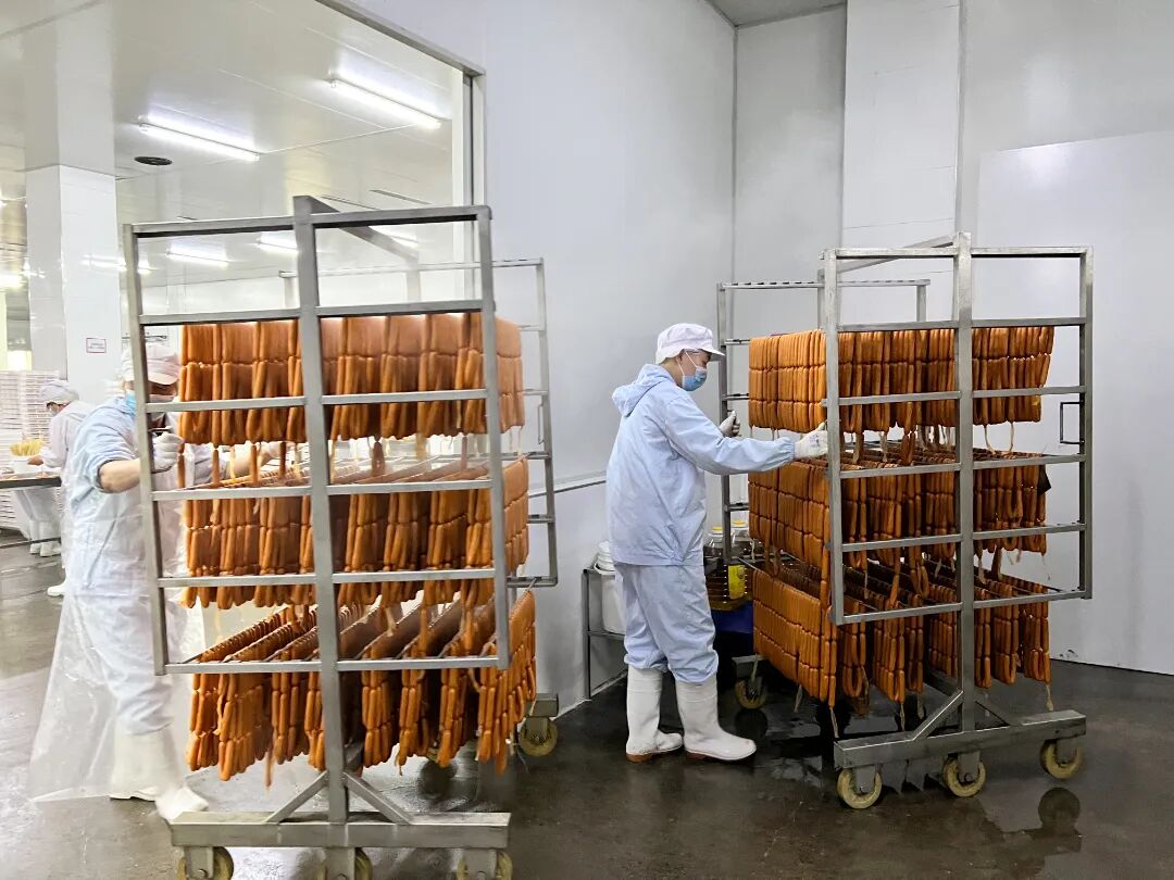 在江苏大红德邻食品有限公司,工人们通过风淋间消毒、更换工作服,经过一系列消杀程序,进入生产线。加工车间肉香四溢,多台全自动的加工机械开足马力生产肉食制品,工人们正在进行分拣、烘炸、灭菌等程序,一袋袋脆骨肠、鸡块等肉食产品经过包装,被整理装箱等待发货。