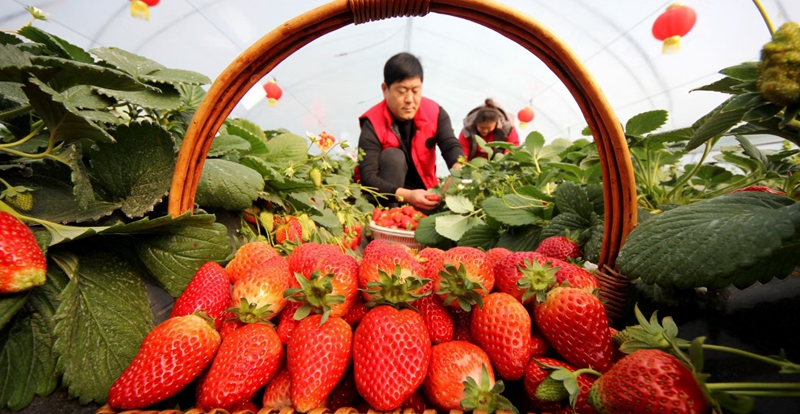 志愿者正帮忙采摘草莓