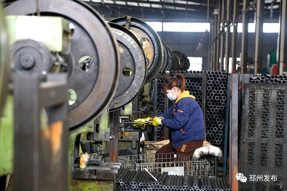在康力源体育科技有限公司车间内,机器运转,工人有序作业,生产场面热火朝天。
