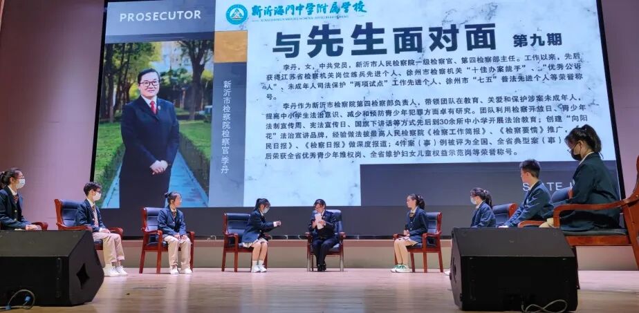 金秋十月,在党的二十大胜利闭幕之际,为了弘扬社会主义法治精神,深入开展法治宣传教育,近日,新沂市人民检察院第四检察部主任李丹受邀到新沂海门附中参加该校第九期“与先生面对面”活动。