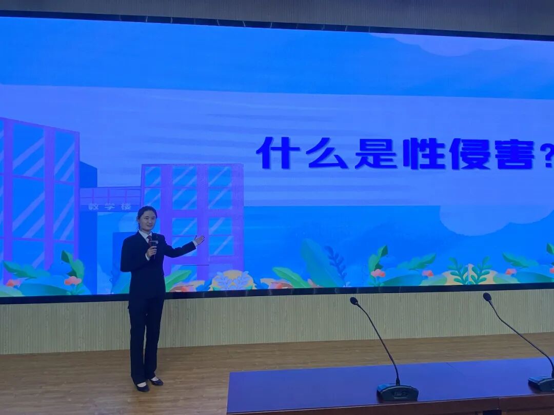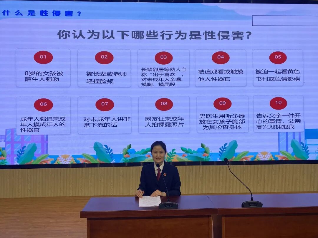 活动开始,丰县人民检察院第四检察部副主任邵会娟结合学生们年龄小、分辨能力差、易受诱惑的特点,从如何预防“性侵害”为主题,深入浅出地讲解。内容丰富、语言通俗易懂,通过短视频及办理的真实案例,给学生以警示和启发。