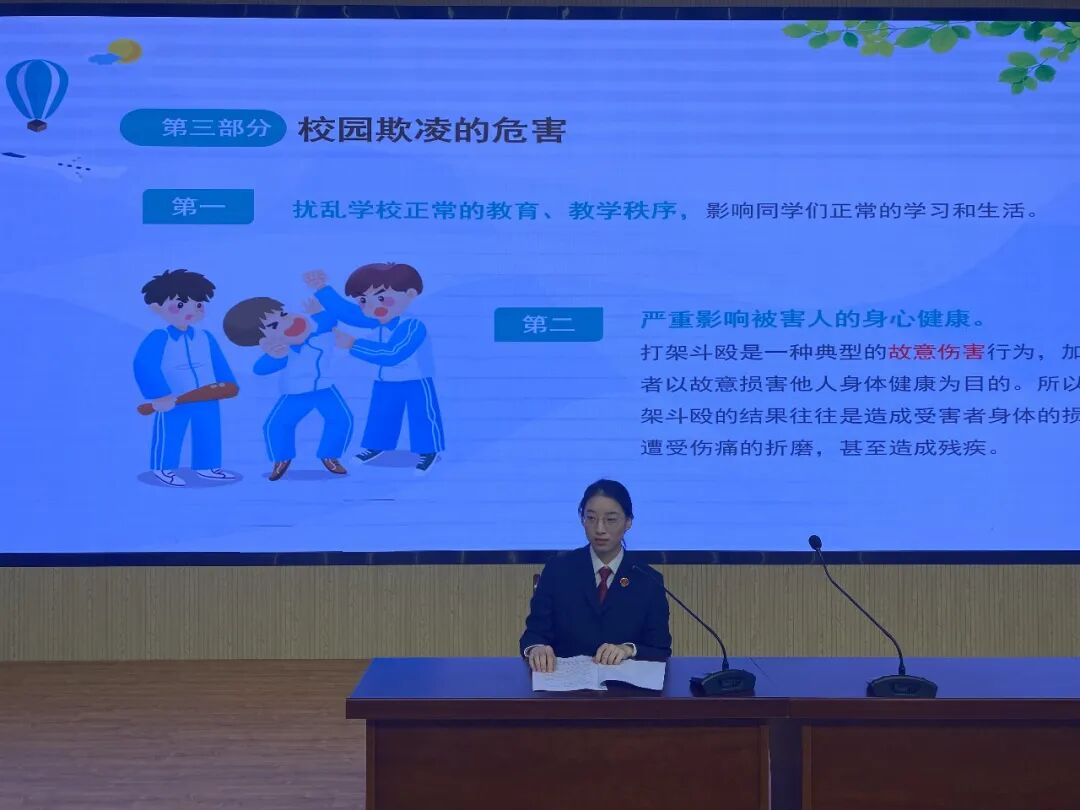 随后,丰县人民检察院第四检察部干警陈童渝,以“预防校园欺凌”、“认识电子烟的危害”等主题,与学生沟通、互动交流,告诫同学们要增强法治意识、安全意识、自我防范意识,远离校园欺凌、电子烟,不沉迷于网络游戏,不因恶小而为之,做一名知法守法的小学生。