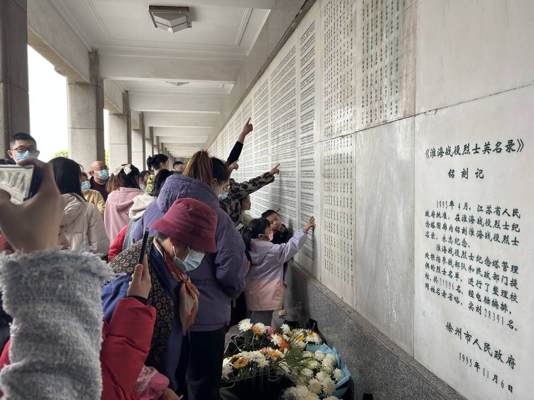 淮塔背后的围廊里,铭刻着淮海战役烈士英名录。清明时节,密密的名单前,靠墙摆放着连排的鲜花、水果。来此瞻仰的人们神情肃穆地注视着一行行名单,人群中不时有烈士亲属在某一处名单前鞠躬、祭拜。