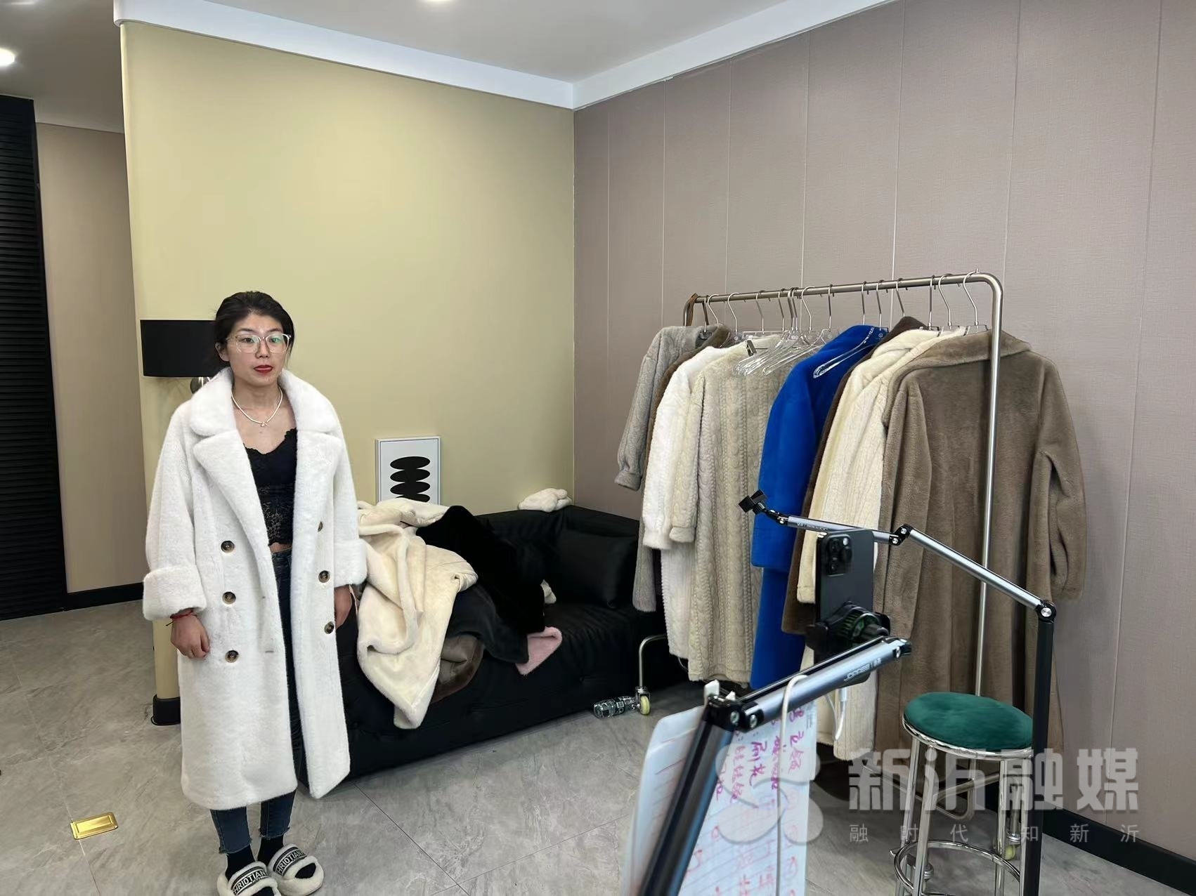在墨河皮草产业园的直播基地,一场线上带货直播正在进行,主播一边现场展示衣服的细节,一边在镜头前与观众互动,短短20分钟,就直播销售了近百件。