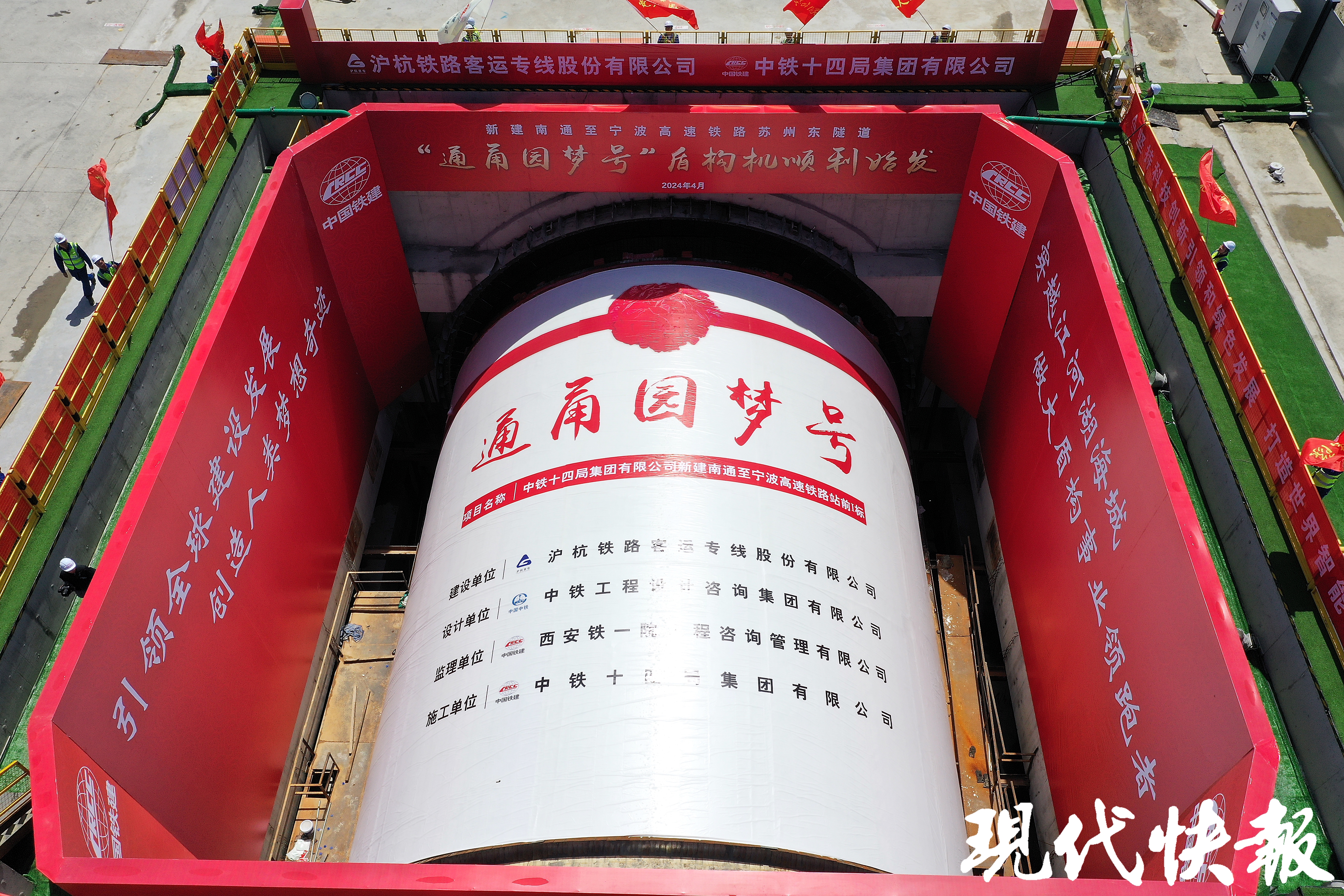 4月18日10:16,在阳澄湖畔苏州东隧道施工现场,伴随着“始发”指令的下达,中铁十四局“通甬园梦号”盾构机刀盘开始缓缓转动,全国最长城市高铁隧道——南通至宁波高铁苏州东隧道正式开始盾构掘进,标志着项目建设取得重大进展。