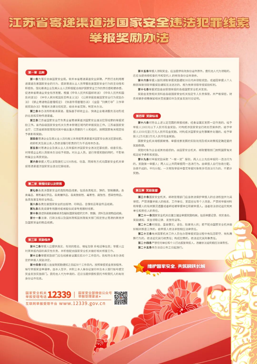直接衔接《公民举报危害国家安全行为奖励办法》。该文件将目光聚焦至寄递这一重要行业,在举报渠道、奖励机制、奖励范围等方面与《公民举报危害国家安全行为奖励办法》保持整体一致。同时,在奖励个人的基础上,增加了对贡献突出企业进行奖励的有关内容,全方位调动寄递行业维护国家安全的积极性,实现全民参与,全民联动。